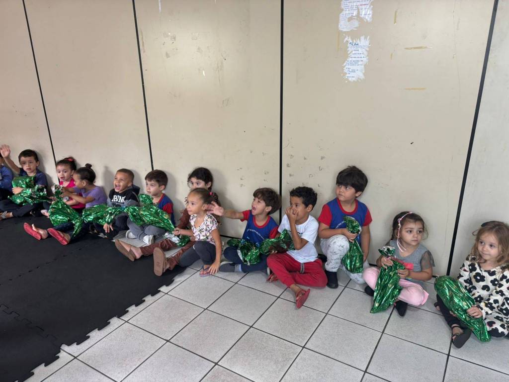 Os presentes foram distribuídos em embalagens verdes, remetendo ao clima natalino. Para tornar a atividade ainda mais lúdica, o interactiano Salomão atuou como Papai Noel, com figurino cedido pela própria creche, enquanto a interactiana Manuela se caracterizou como duende, trazendo alegria e interagindo com as crianças desde o início da visita.